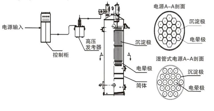 电晕电极装置通过吊杆悬吊在顶部的绝缘箱内,它由上部吊杆及拉杆、上下框架、电晕电极导线、重锤组成。